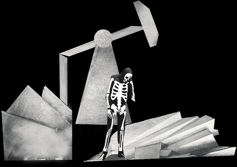 ‘Fossils’ maps the interlinked logics of extraction at work in ecological collapse and the exploitation of human capital across three short live vignettes. It seeks to challenge both the fatalism of seeing capitalism as a force of nature and the vitalism of imagining nature without humans. The monologue of a decaying skeleton attempting to unionise his undead comrades reflects on class (de)composition. Two decoy trees, echoing the arboreal observation posts of the first world war, reflect on the way humans project meaning onto their natural environment. A many-headed oil spill mediates these perspectives: it is legion, a multitude at once demonic and pathetic, declaiming market values and anticipating their apocalyptic end. Together, these scenes from the near future explore the ways in which value extraction is intensified as new sources of growth become scarce. They examine the relationship between acting and actants, between theatre as a space for representation and performance as a site of action. Deploying Brechtian performance strategies, they stage a demand for collectivity and solidarity in a diminished public sphere.